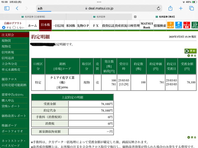 クミアイ化学工業現物買い利確✖️3
