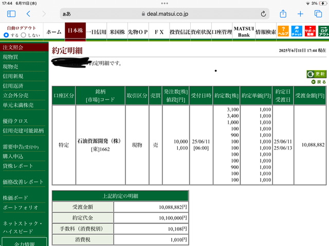 石油資源開発現物買い利確✖️1