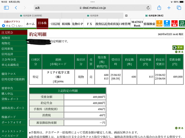 クミアイ化学工業現物買い利確✖️1