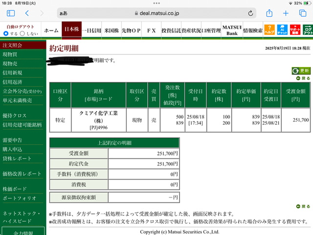 クミアイ化学工業現物買い利確✖️1