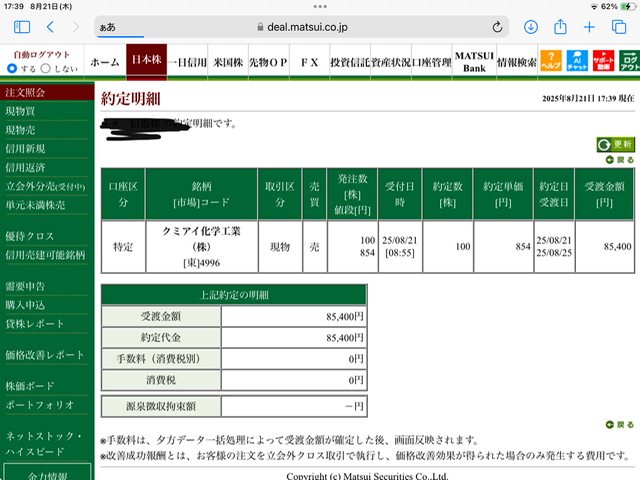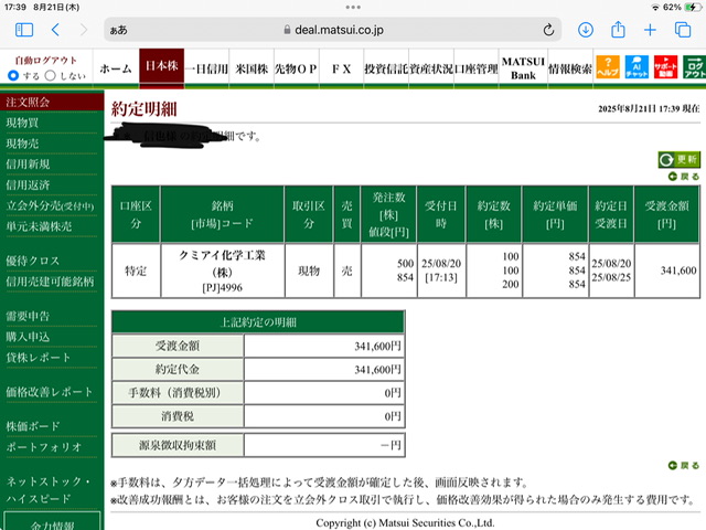 クミアイ化学工業現物買い利確✖️2